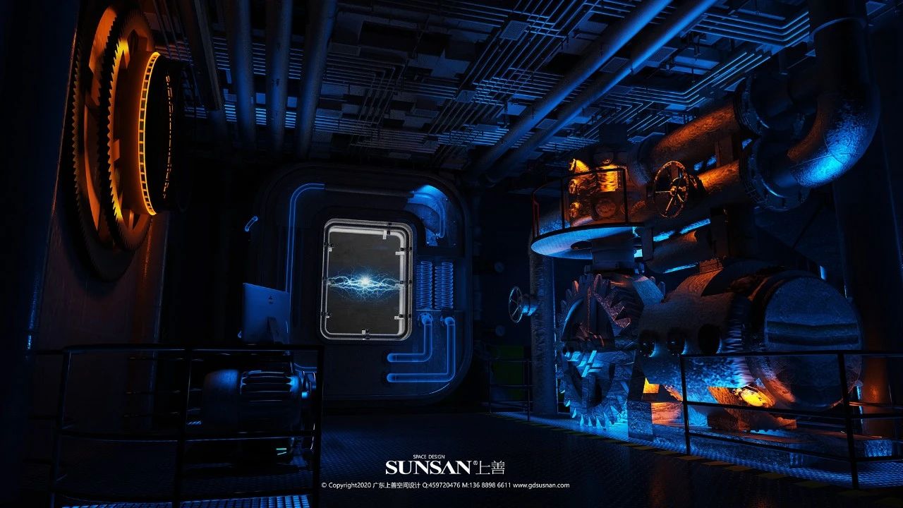 The bar lobby, stairwells, toilets and other areas use gears, pipes, motors, industrial cans and other elements to create a futuristic industrial space with a punk effect. The small Tesla coil lightning device in the lobby is the finishing touch of the whole space, adding a futuristic atmosphere to the whole space.