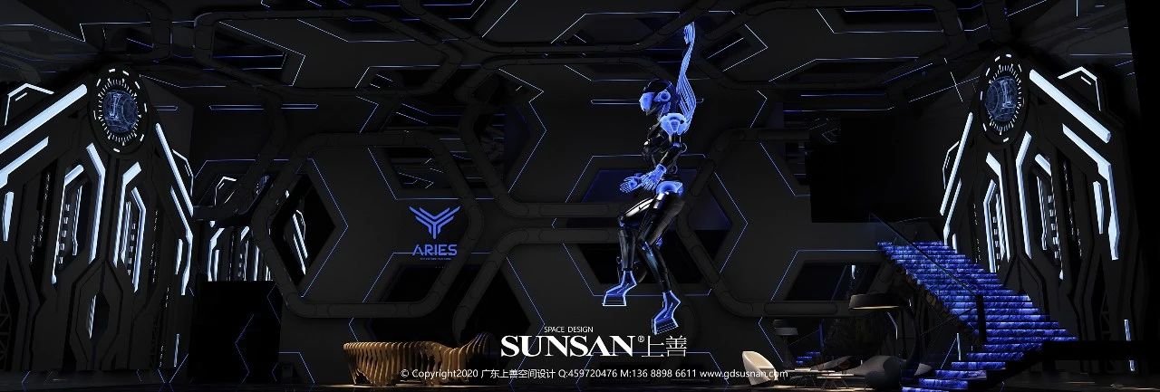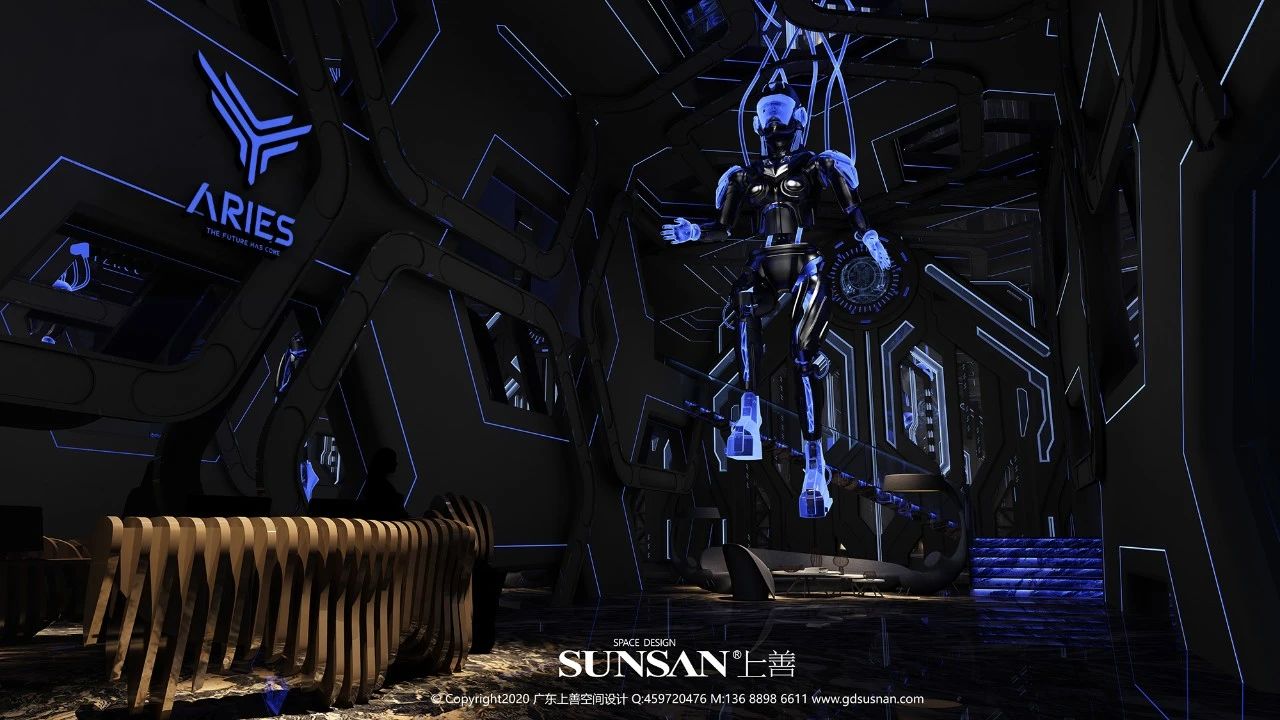 大堂的双层六边形造型、大堂左右两边造型和悬空与大堂中央的科幻机器人充满科幻未来感。