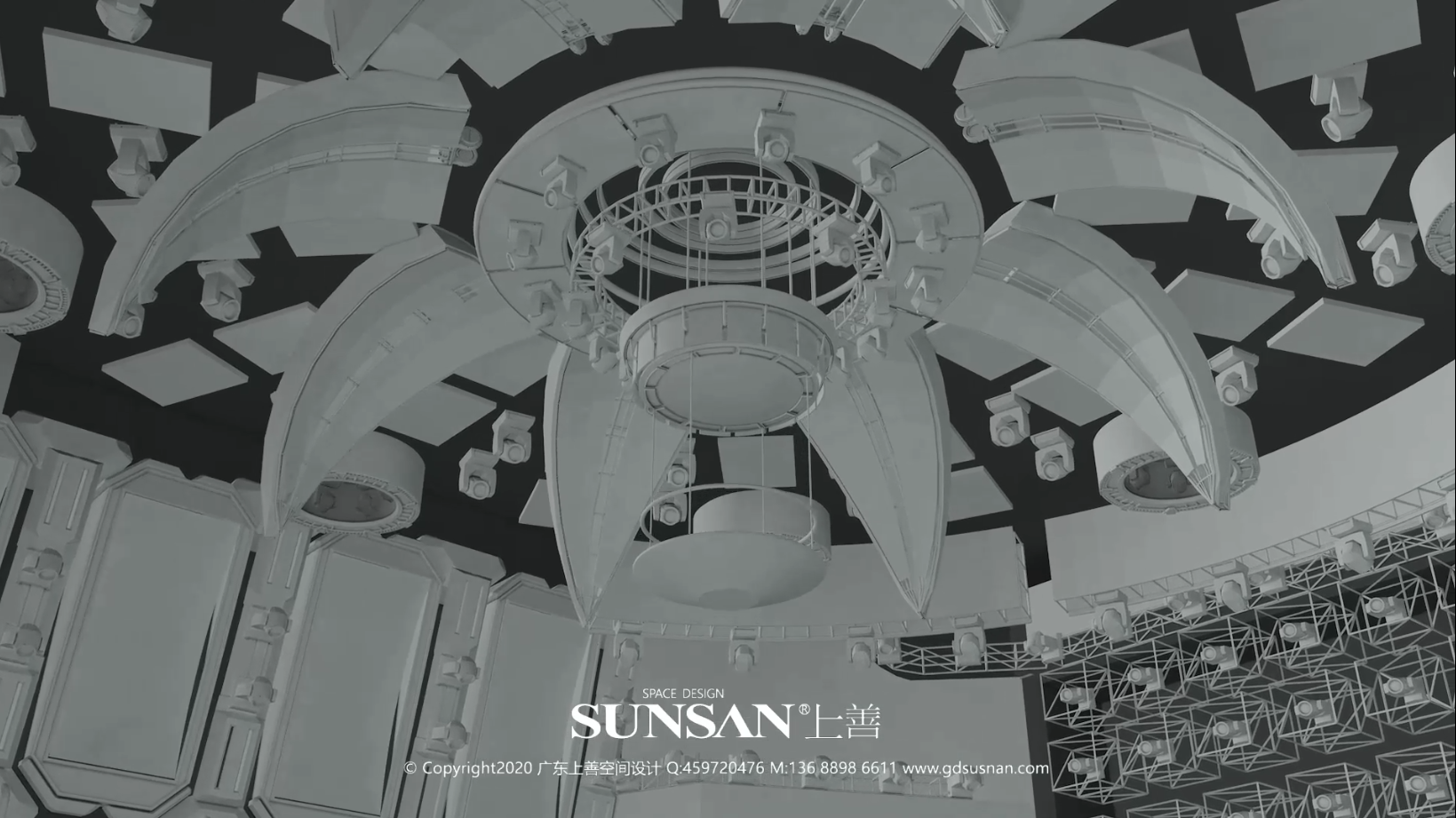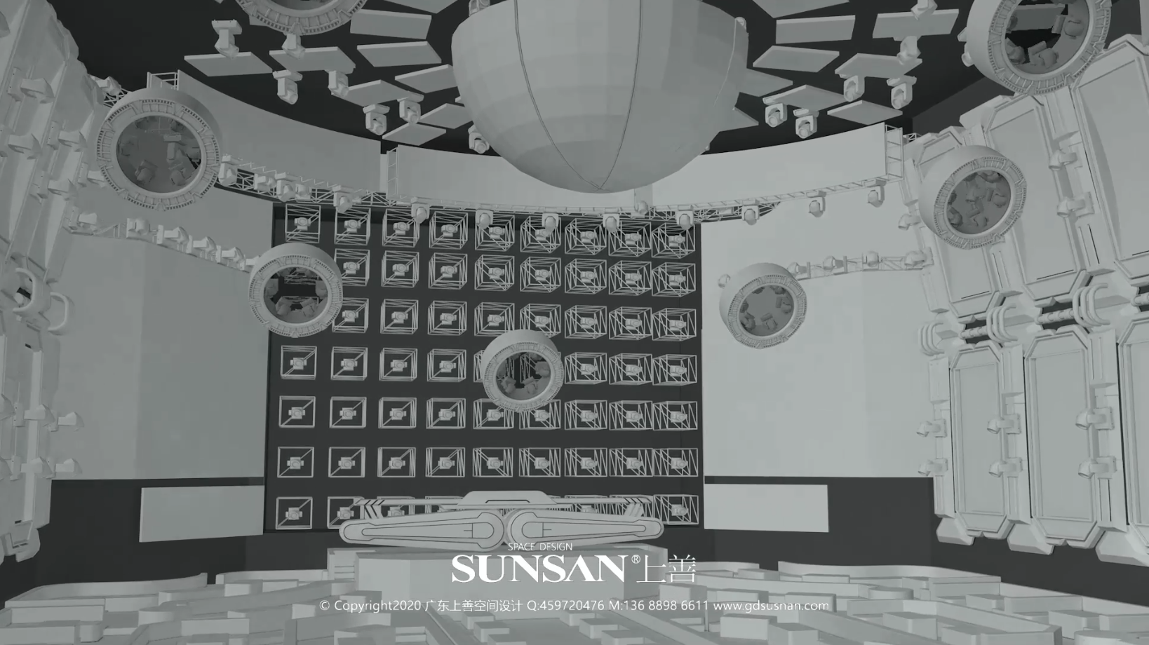 中央核心直径7.5M半球形开合屏,内外分别由led灯带和高清透明LED屏覆盖,可为现场提供动静两重视觉光源形态。静态“恒星”模式下的中央球体四周的8个“行星”升降翻转,以星系的整体姿态轻易改变全场视觉。