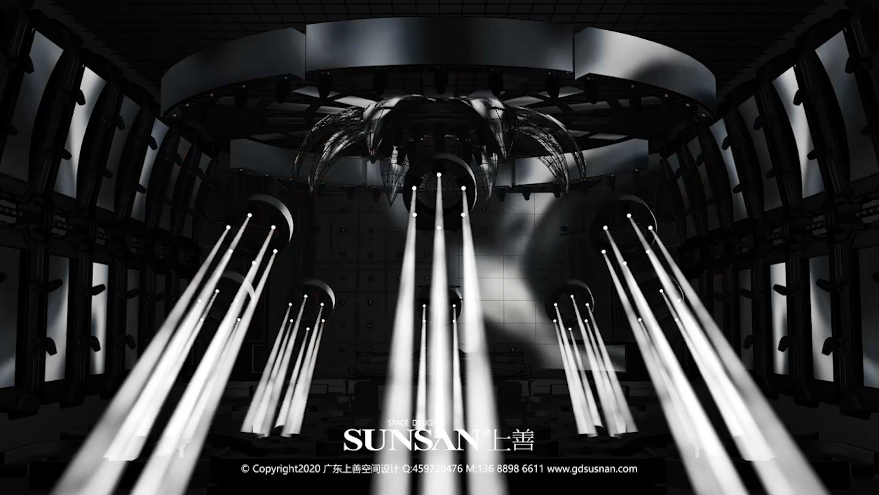 当中央核心充能沉潜至极限,动态“星耀”模式随之打开,整个核心球体一分为八,内部LED灯带暗流涌动。藏于半球形中的升降DJ舞台随之下降,随着dj的激情表演,让现场气氛达到至高点。配合球体附近散射状透明屏升降漂浮,更富视觉变化。外圈6个弧形灯架,每条均配备数台光束灯与高清LED屏,与8圈外延“行星”装置相互辉映。