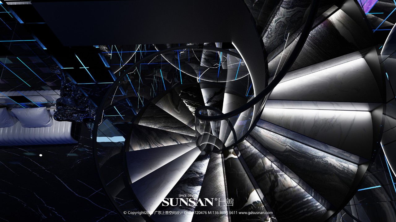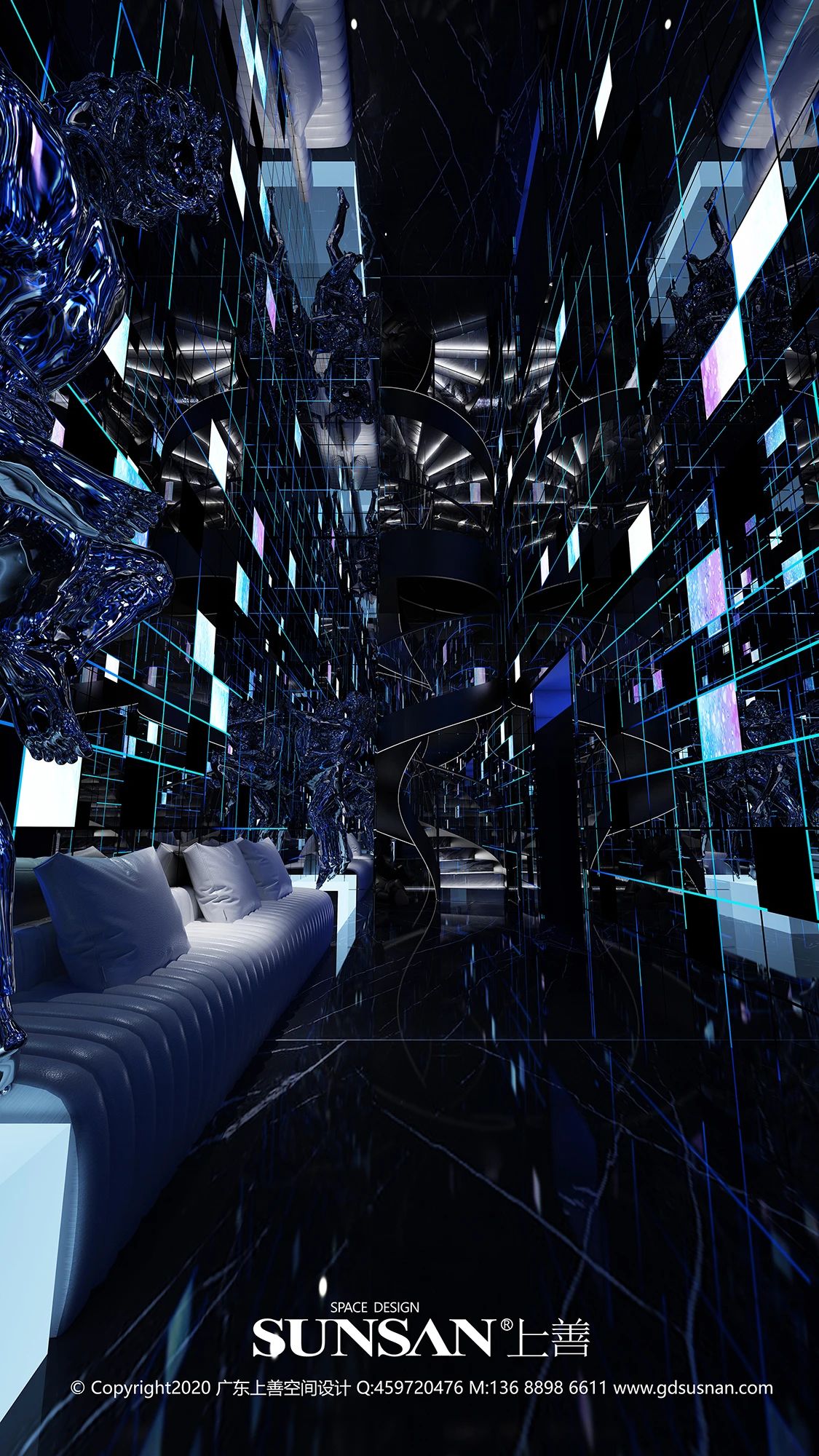 走道两侧设计师运用镜面让线条灯带、屏幕相互映射,让玩家感受到穿越时空的迷幻感,镜面天花与走廊中的电镀雕塑,使整个空间变得更加迷幻。