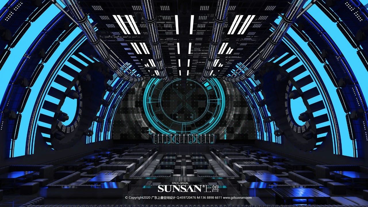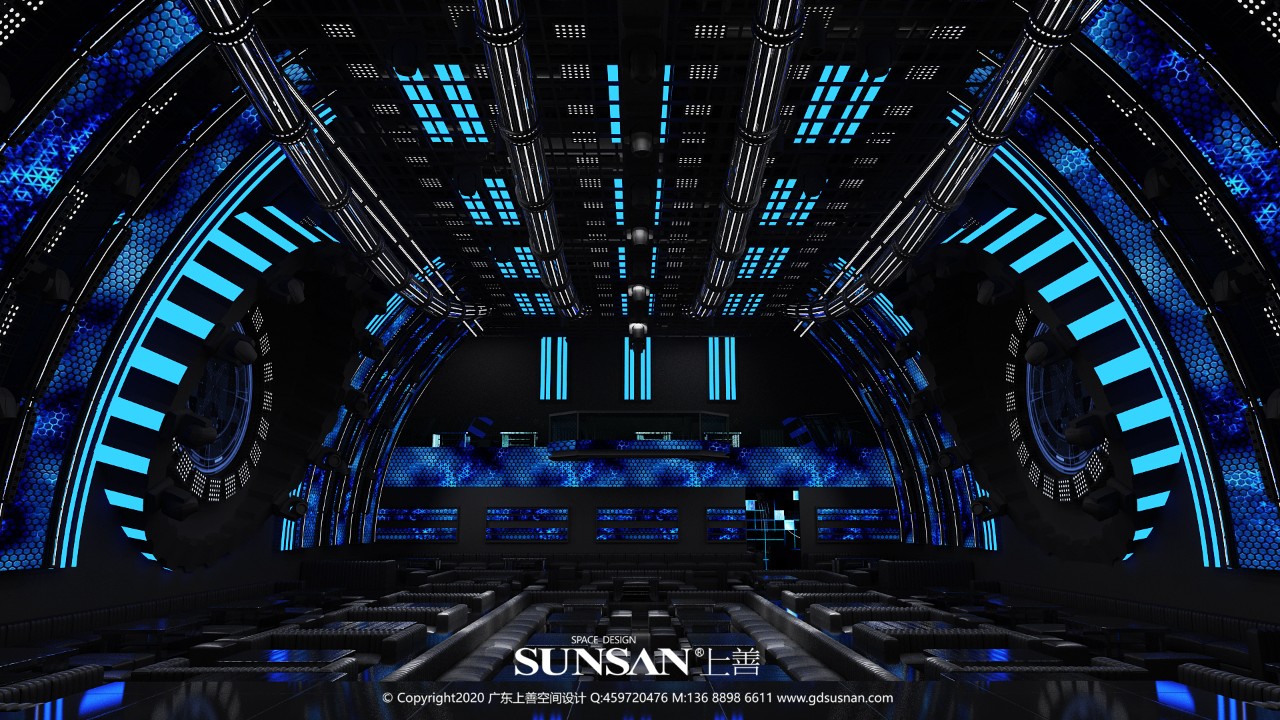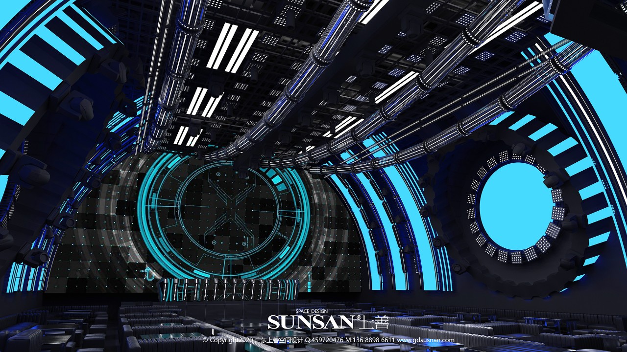 弯穹大弧形跨度空间,出色的挑高让这里的空间设计更加自由。主屏采用超大LED透明屏,背后隐藏数百台380光束和8台10W全彩激光,大厅的顶部48条科技感爆棚的柱形LED灯带装置排列成4列,通过动态数控可实现升降、倾斜等动作,伴随场景音乐实现更立体化的空中特效,打造或扭曲,或层叠的异度空间。 当然,仅有机械是不够的,灯光的配合也非常巧妙。舞台主屏幕镶嵌的四组弧形灯架与顶部阵列形式排列的灯架,在不经意间光柱从巨型透明LED屏幕间穿出,倏尔炸裂,仿佛来自屏幕里的平行时空与现实相连。舞池四周,360°的屏幕环绕着整个场地,营造更具沉浸感的视觉场景。 等所有灯光绚烂绽放,你就会发现冰屏的妙处:极高的透光率让光线从屏幕的场景中穿透而过,三维空间似乎不足以描述那霎那间的震撼。
